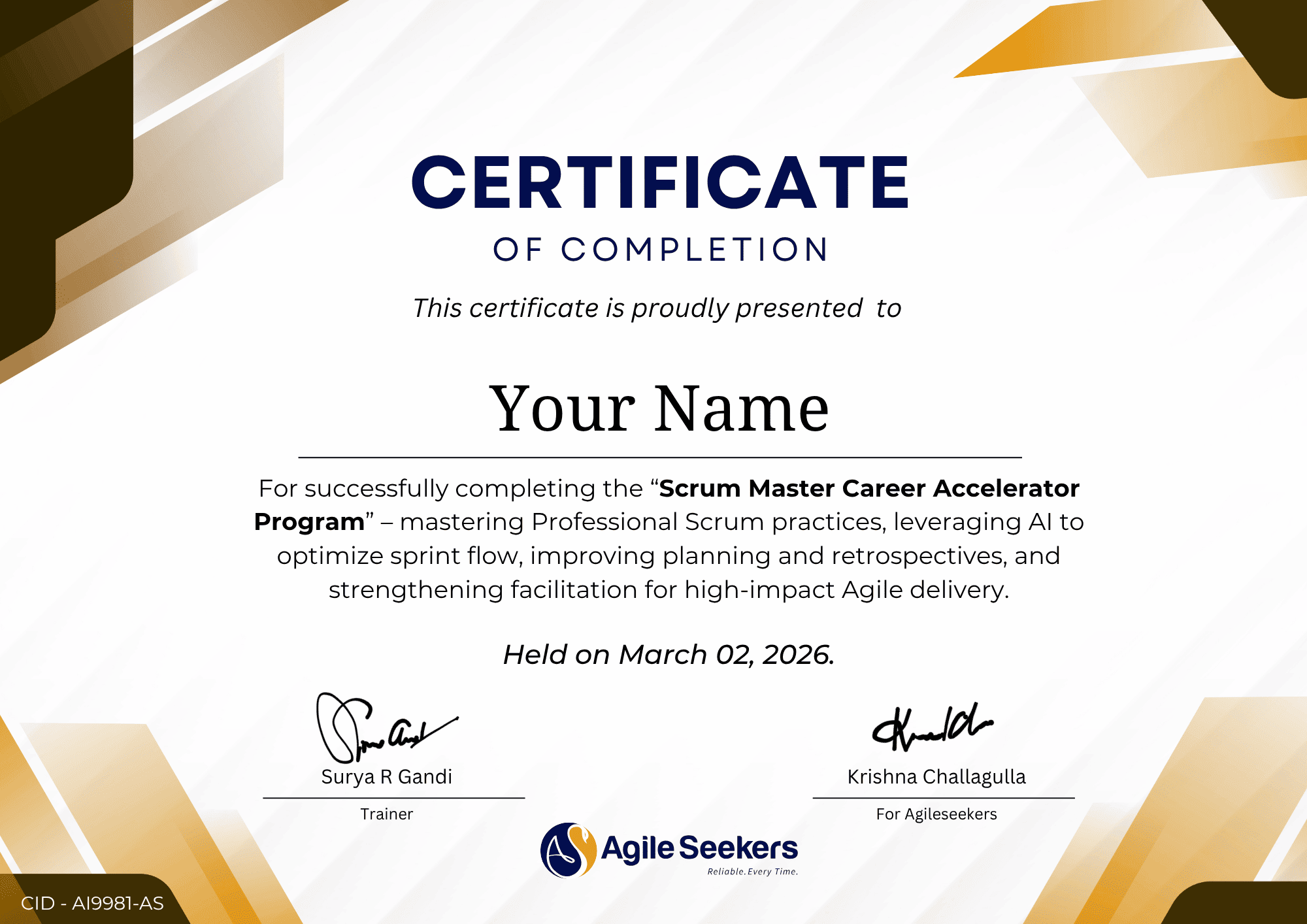 You will be prepared for and receive certifications such as PSM, SAFe Scrum Master, and AI for Scrum Master